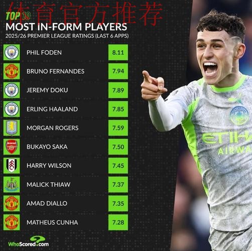 近6场英超场均评分前10名:福登第一,B费、多库排名前三